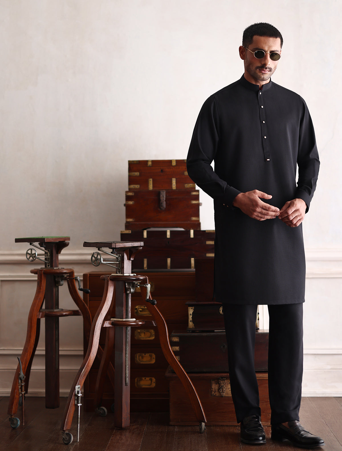 A high end black textured kurta pajama featuring classic gold details. A must-have in every man’s wardrobe.