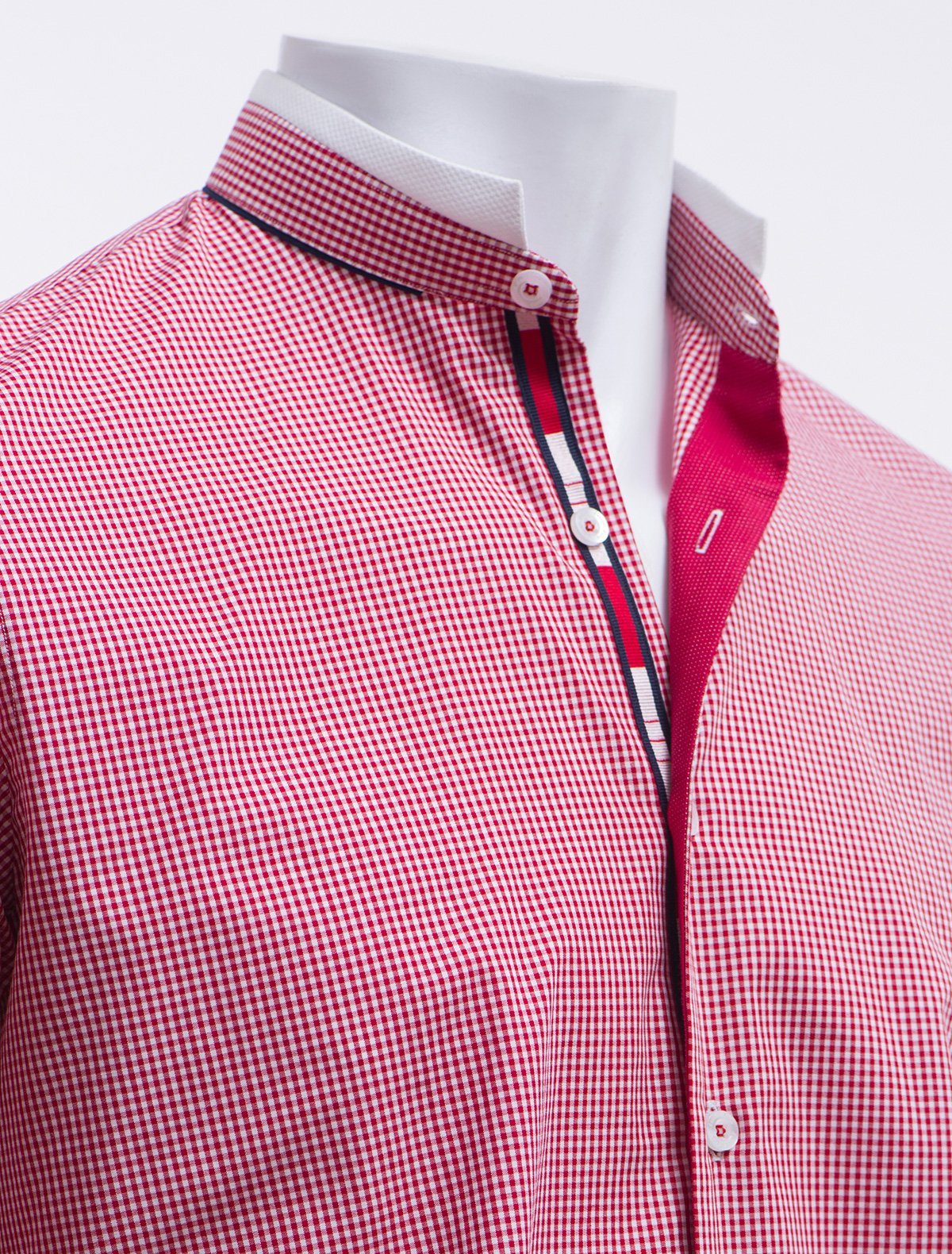 Red and white checkered dress shirt with red details. A must have for a sophisticated look.