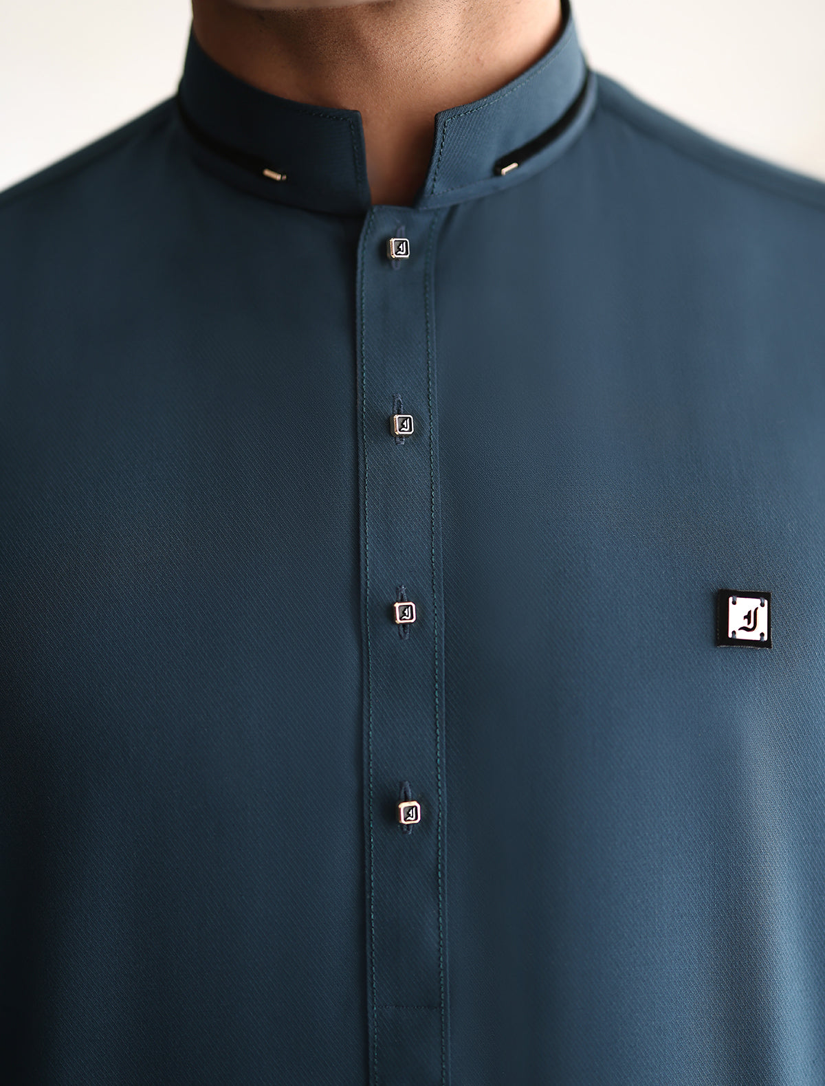 Teal blue velvet detailed kameez shalwar. Pair it with your black patent shoes.