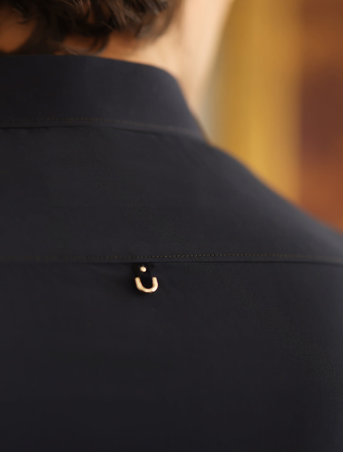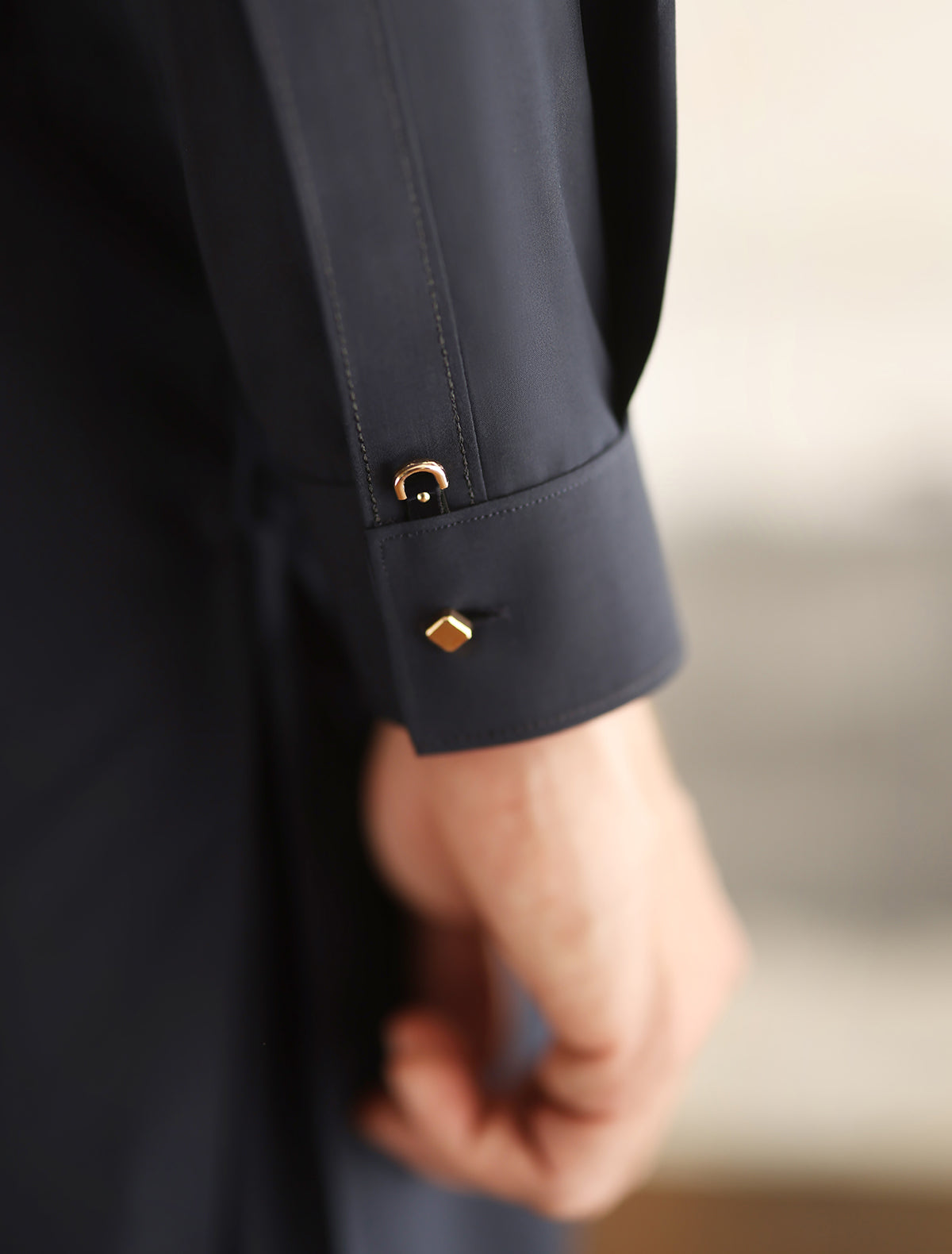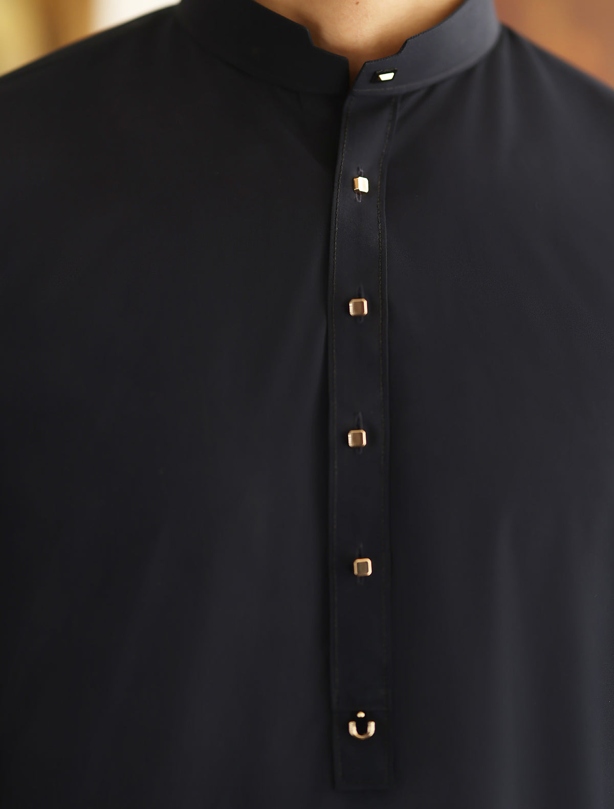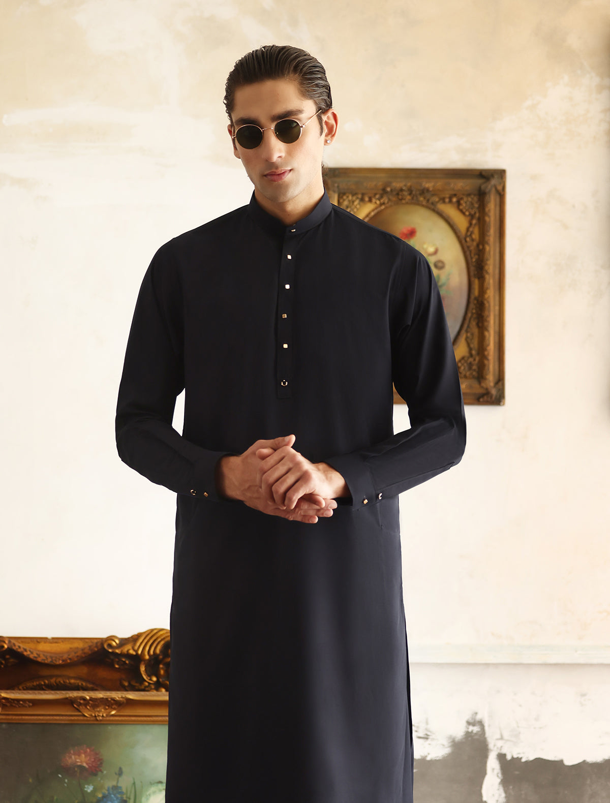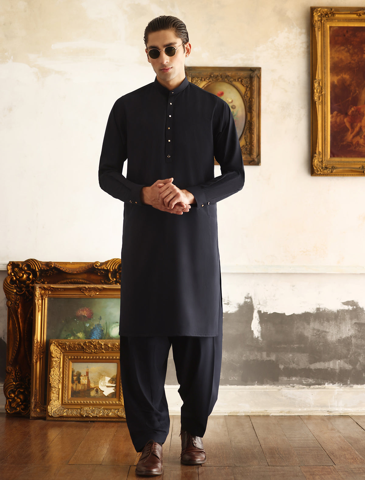 A fine navy kameez shalwar featuring Ismail Farid iconic details. - Mandarin collar with velvet and accessory details.
