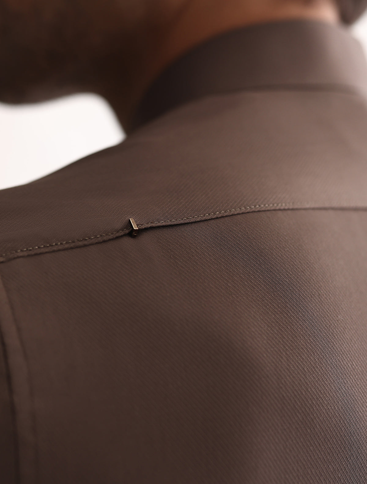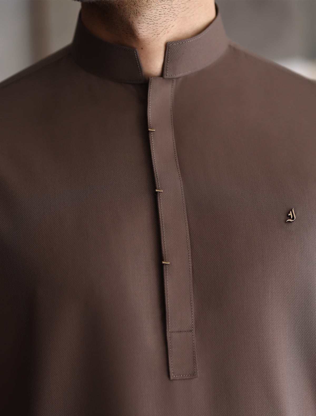 A luxurious dark taupe textured kameez shalwar featuring gold logo accessory on front. A must have for every man.