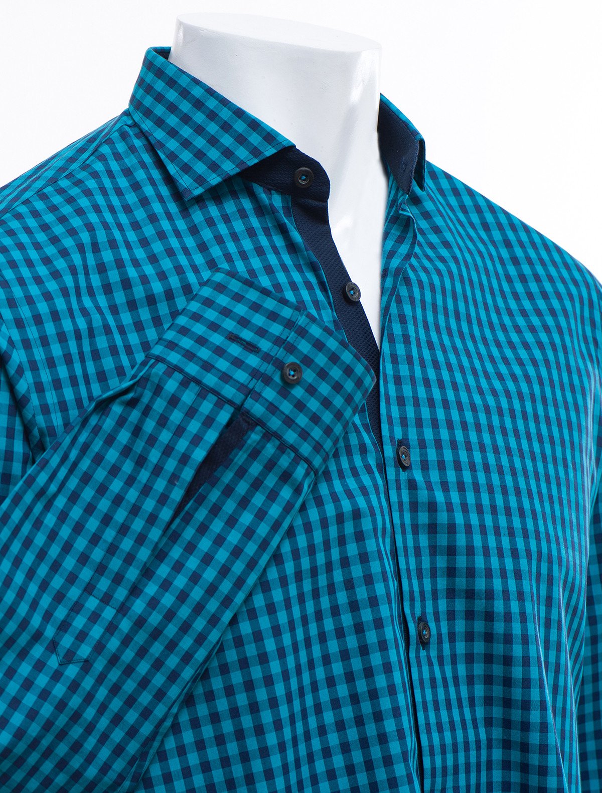 Navy check pattern shirt with turquoise base and navy inner details. This Ismail Farid dress shirt serves as a perfect addition to your wardrobe this summer.