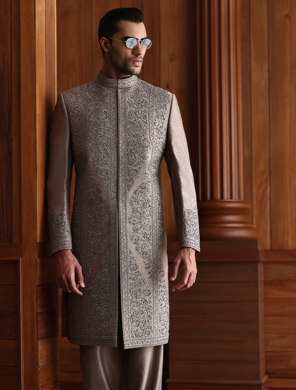 Taupe hand embroidered sherwani with a traditional pattern and intricate embroidery, can be worn buttons open or close and with matching color shawl or can also be worn with color complimenting the bridal dress.