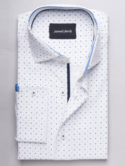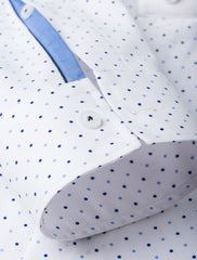 White floral shirt with contrast trim details inside button placket, cuff and collar