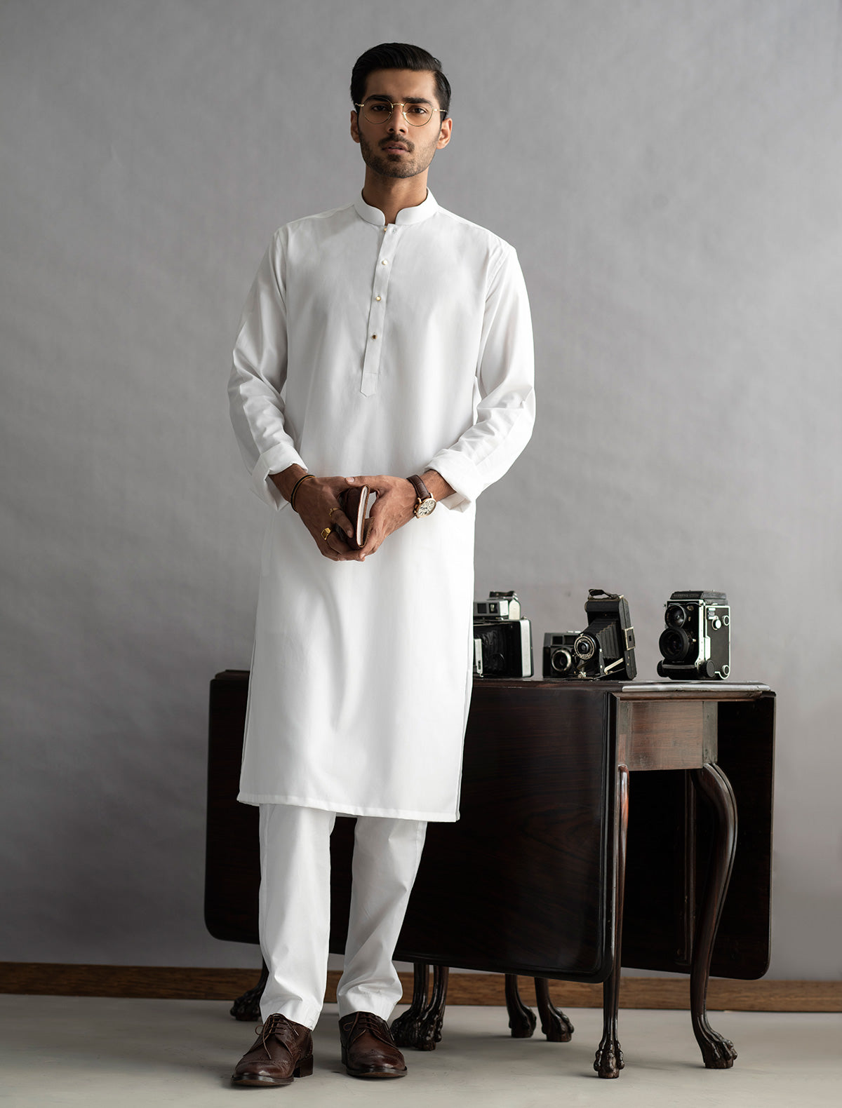 White micro-dot Egyptian cotton kurta with gold buttons.