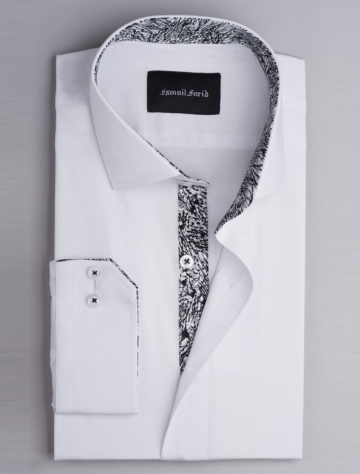 White cotton shirt featuring a cut collar and floral print details inside collar, front placket and cuffs. For the stylish and confident men.