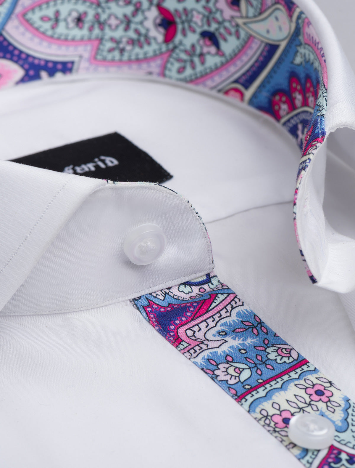 White cotton weaved shirt featuring a cut collar and floral print details inside collar, front placket and cuffs. For the stylish and confident men