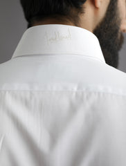 Crisp white self Kameez Shalwar featuring button-down collar and Ismail Farid embroidered signature behind collar.